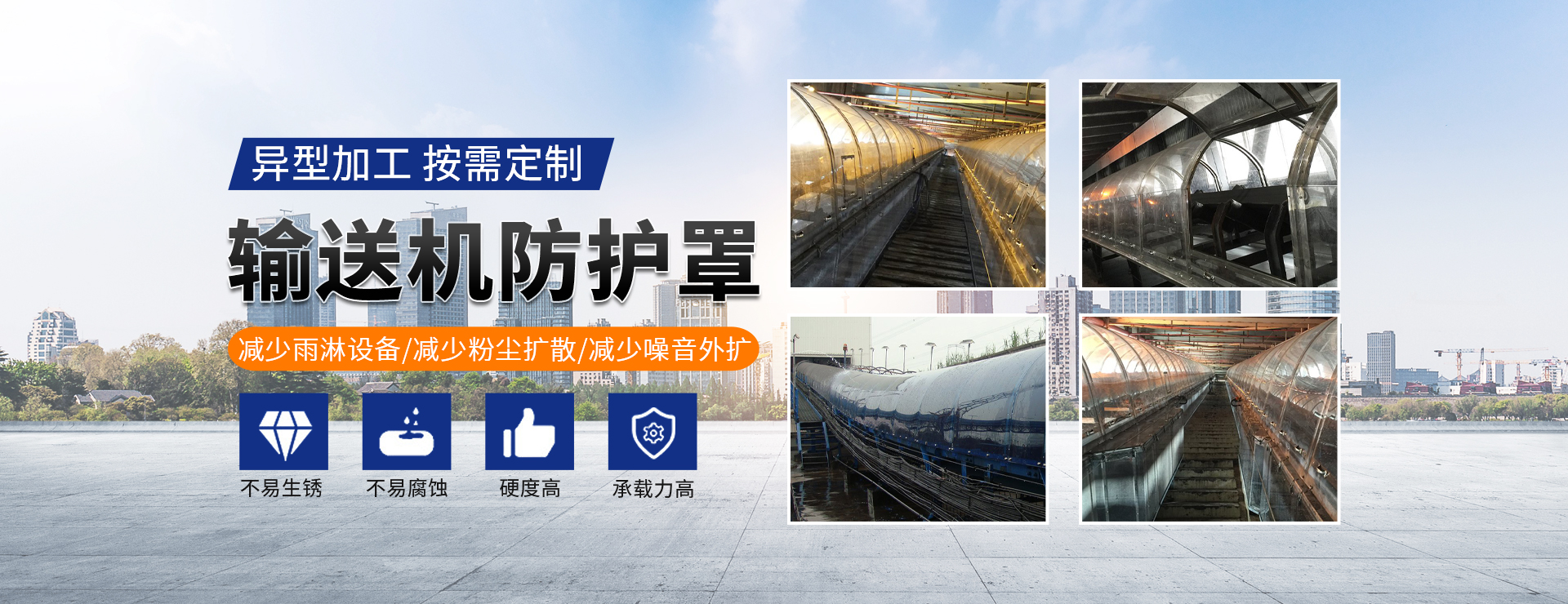 我公司成立于2004年,生產輸送機降塵抑塵封閉所需的透明防護罩,依靠多年來工程安裝經驗的豐富積累,實現了從手工粗糙焊接作業到工廠式標準化生產再到現場模塊無焊組裝的飛躍。在確保安全的前提下,可以不停產施工組裝。